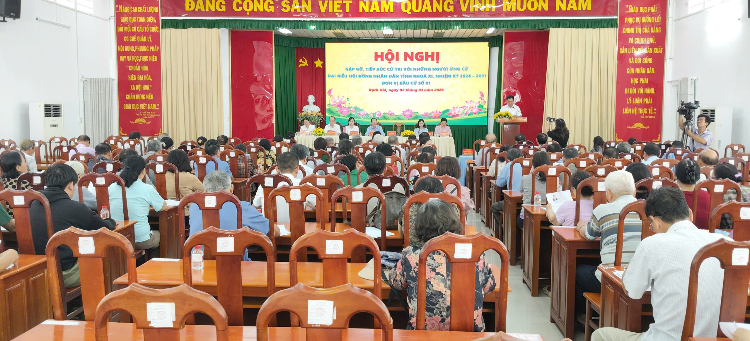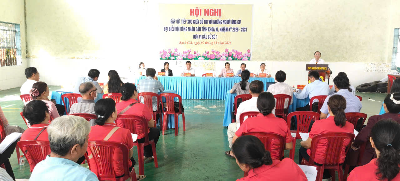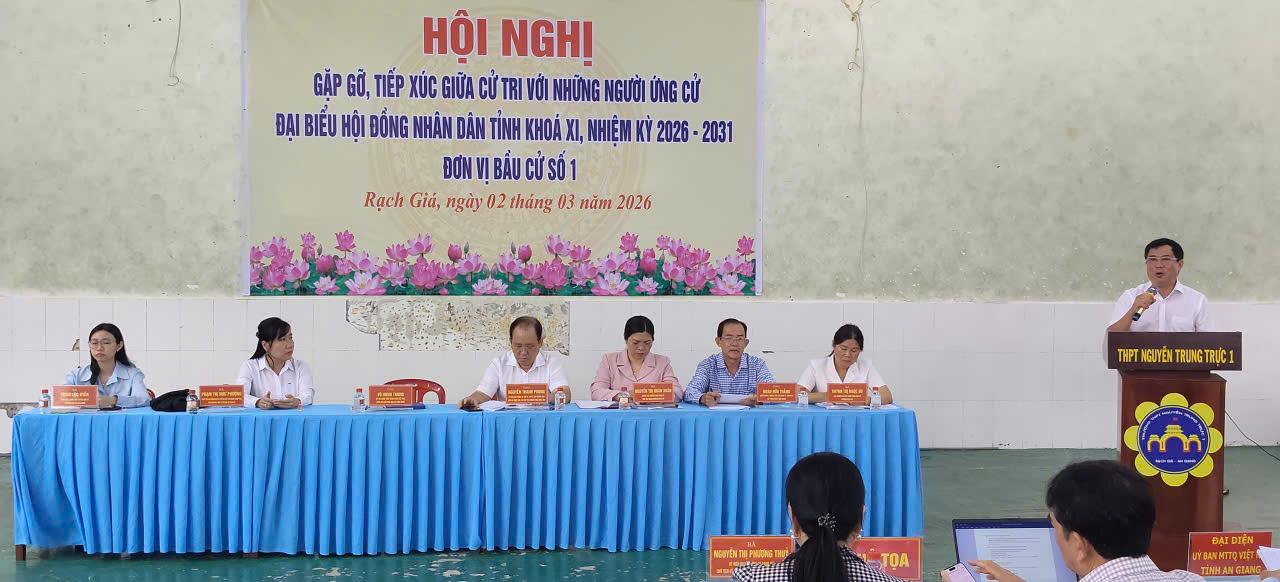 (sokhcn.angiang.gov.vn) - Sáng ngày 02/3/2026, tại Hội trường Trường THPT Nguyễn Trung Trực, Ban Thường trực Ủy ban MTTQ Việt Nam tỉnh An Giang đã tổ chức Hội nghị tiếp xúc cử tri để vận động bầu cử cho các ứng cử viên đại biểu Hội đồng nhân dân tỉnh khóa XI, nhiệm kỳ 2026-2031 (Đơn vị bầu cử số 01).
